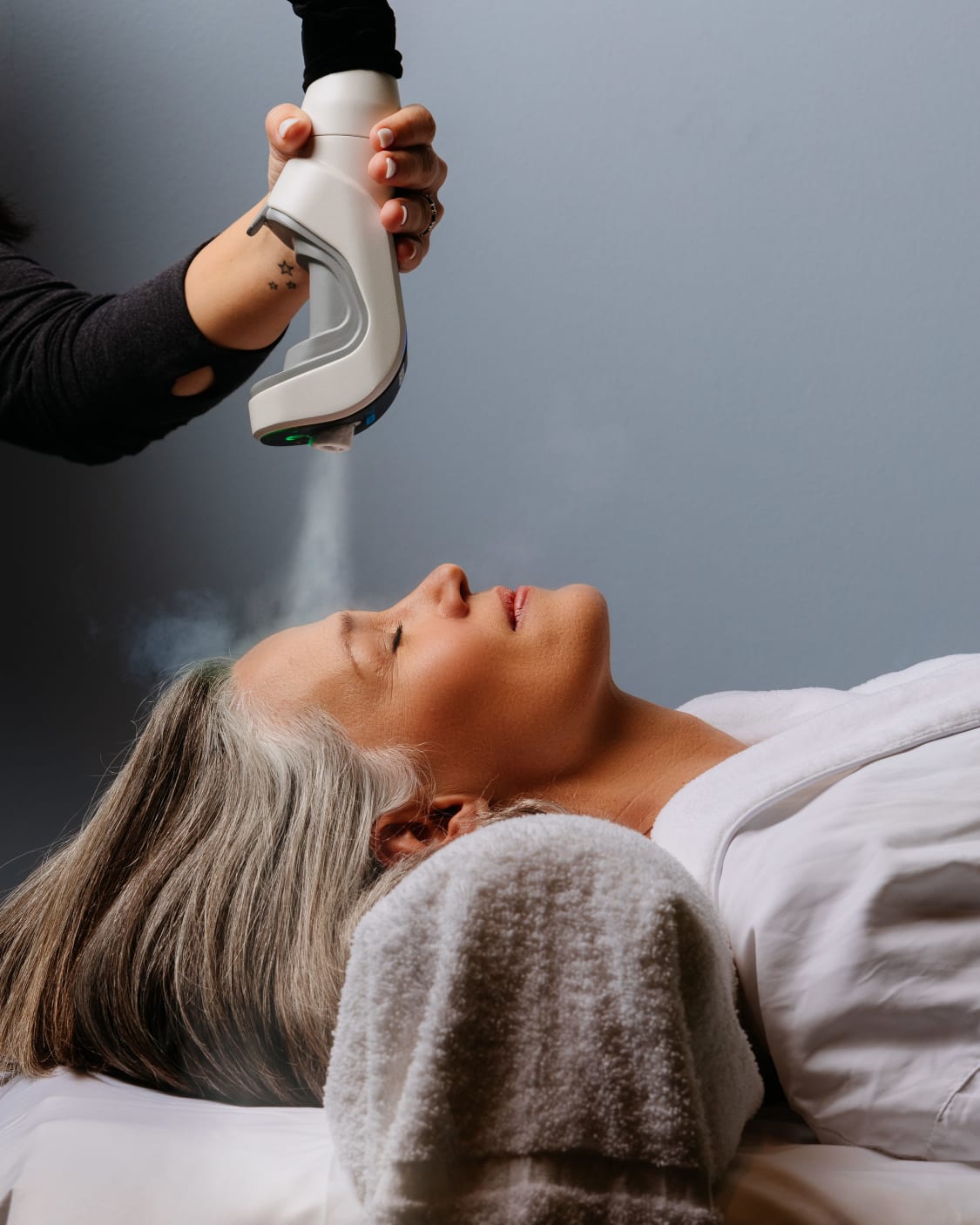 During the session, a stream of chilled vapor is carefully applied to the back of the neck, scalp, and spine. This process interacts with the body’s natural responses, helping create a calming effect while supporting increased alertness. The gentle cooling encourages better circulation and relaxation, making it a simple yet effective way to support the mind and body.